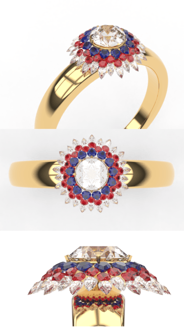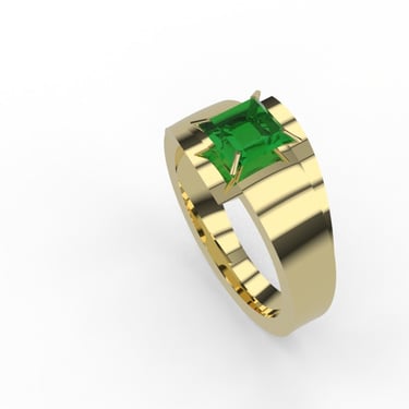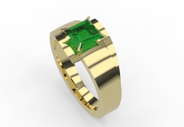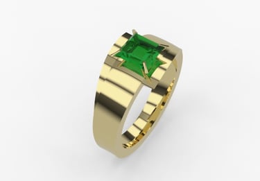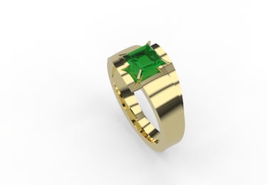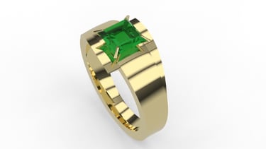 This project highlights a striking ring design featuring a princess-cut emerald set in yellow gold. The bold geometric structure complements the rich green hue of the emerald, symbolizing elegance and sophistication. The combination of gold and emerald creates a timeless yet modern aesthetic.
