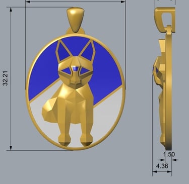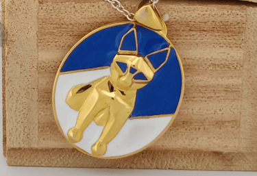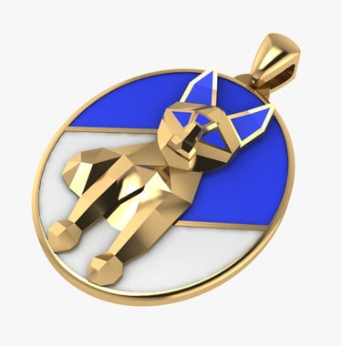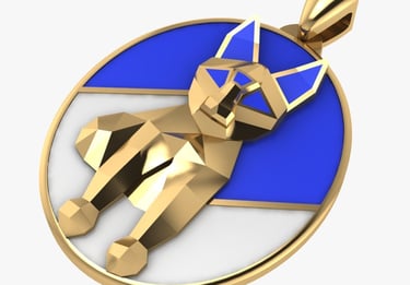 A faceted golden cat sits poised within a luminous circle, its body sculpted in sharp planes that catch the light like fragments of quiet intention. Blue enamel arcs behind it like a twilight sky, a color long associated with calm, wisdom, and inner trust in jewelry. The white segment at its feet suggests new beginnings, framing the cat as a guardian standing between what has been and what is yet to come. In many cultures, cats in jewelry embody independence, intuition, and protective grace, turning this pendant into a small talisman for anyone who moves through the world softly but on their own terms.