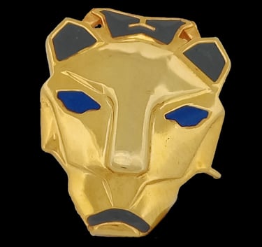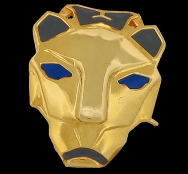 This panther brooch is sculpted in sterling silver and wrapped in a skin of warm gold plating, giving the feline mask a molten, armor‑like glow. Deep blue enamel floods the eyes and markings, a color long linked with loyalty, spirituality, and noble resolve in enamel work, so the gaze feels almost lit from within. Panthers in luxury jewelry symbolize quiet strength, independence, and a mysterious, feminine power, turning this piece into a protective emblem for those who move through the world with grace, but are never to be underestimated.
